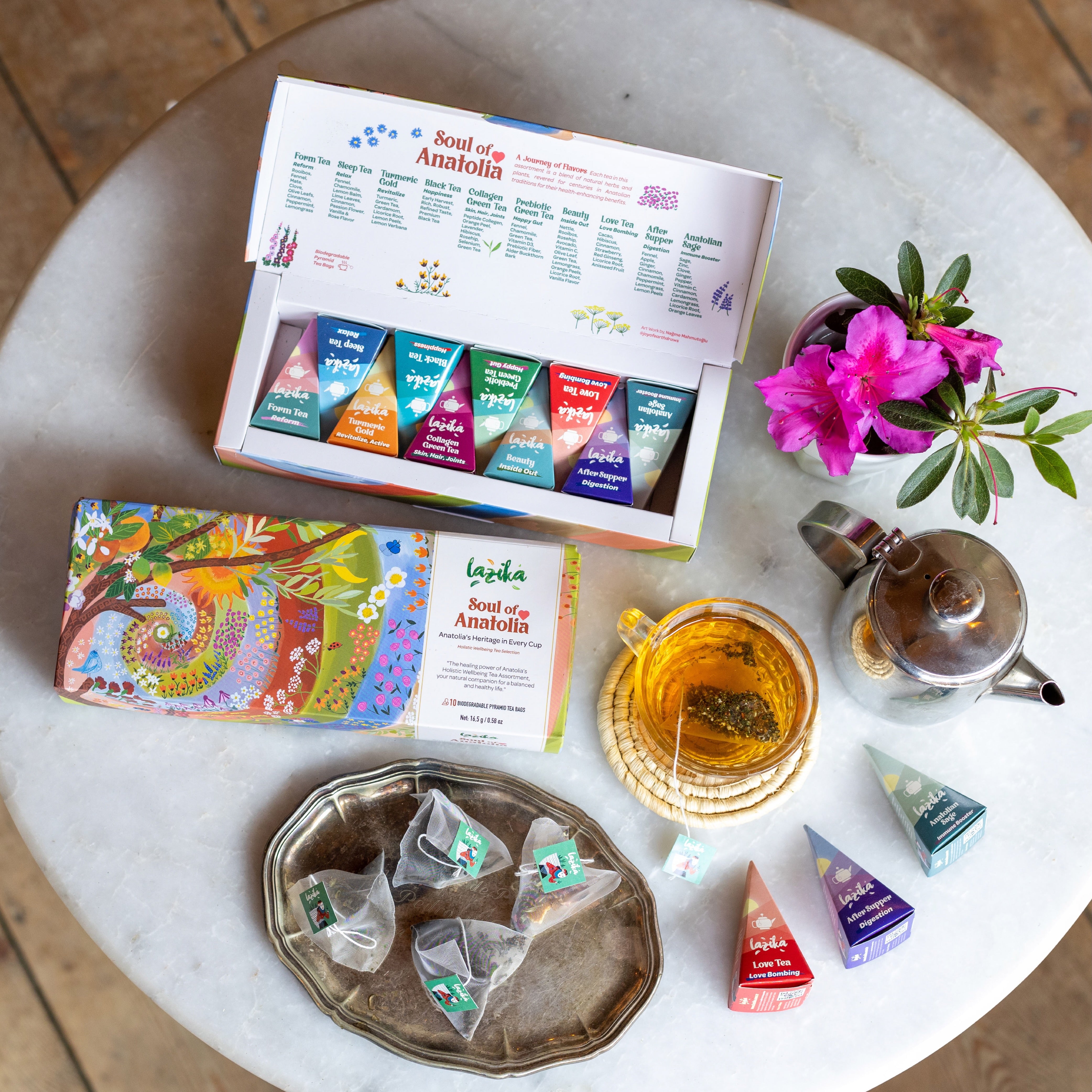 Deliciously Crafted Wellness Infusions 54 Unit Biodegradable Pyramid Tea Bags (Net 81g) Heighten your holistic well-being with our selected blends. This collection supports your comfort and offers a delightful experience. With 9 unique blends, such as Beauty Tea, and Love Bombing, each sip helps your wellness. Discover the combination of ingredients like Anatolian sage, turmeric, and collagen in every cup.