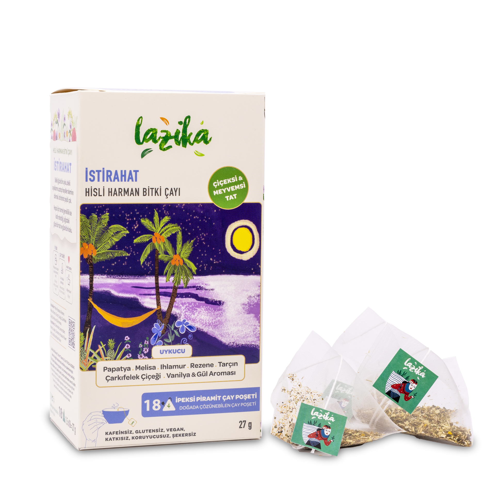 Eco-Friendly Packaging: Our herbal teas and blends are presented in plant-based PLA Non-GMO pyramid bags. Our packaging is recyclable, has a minimal carbon footprint, and is made from materials selected to best preserve the aroma and integrity of the blend and to be safe for human health. Vegan: This tea is suitable for vegan consumption and contains no animal-derived products. Sugar-Free: This tea contains no sugar. We Have a Purpose: Lazika is a producer of impact. For us, tea is a design project. We create our herbal teas and blends by bringing together the right herbs sourced from the best producers. Besides flavor and quality, we value increasing our regional impact. Our main goal is an approach where every herb and every effort is rewarded; where production is supported for a better future. For more detailed information, please visit our Purpose page.