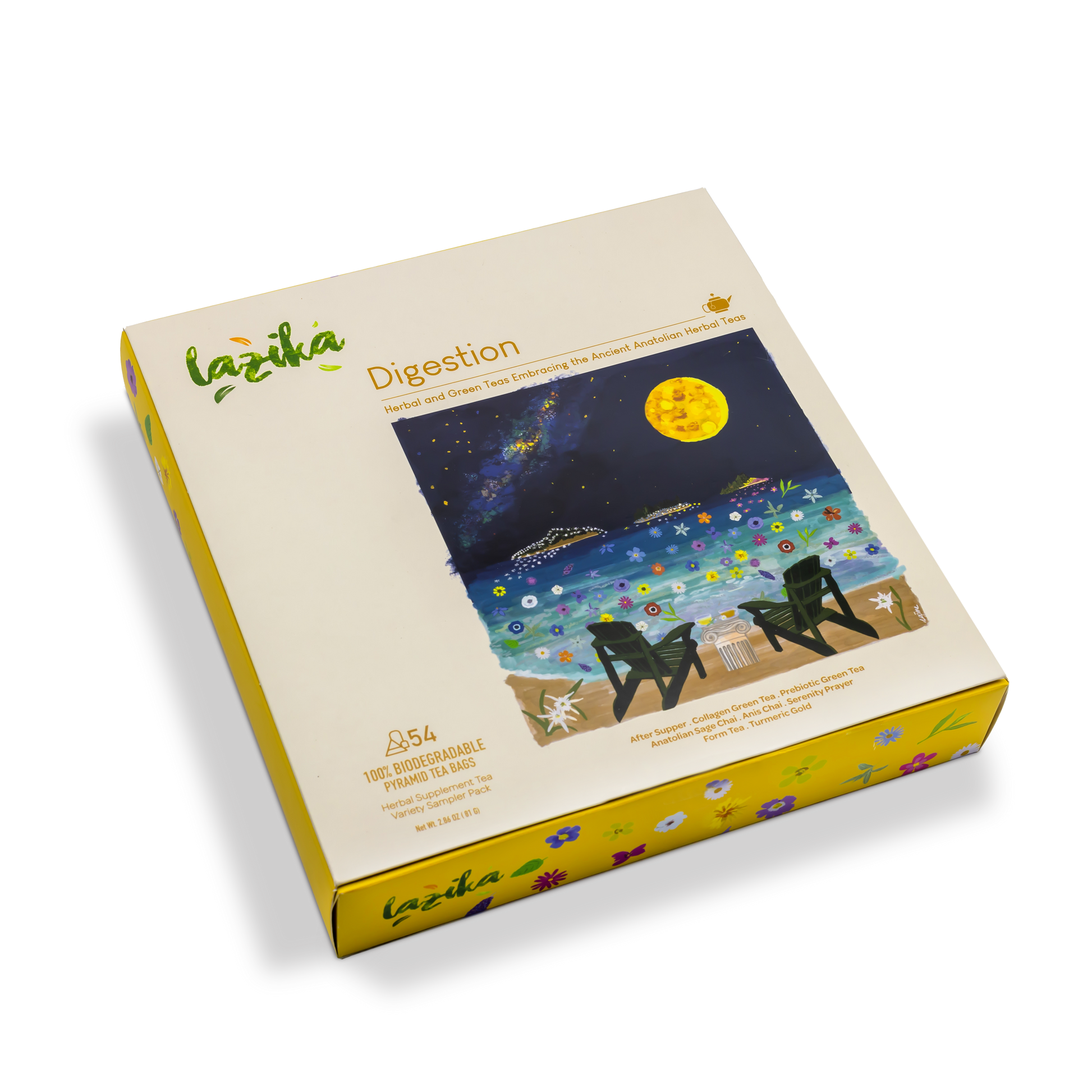 Lazika’s carefully selected teas that support normal digestive health come together in one box. The set contains 54 biodegradable pyramid tea bags in 8 different blends.
